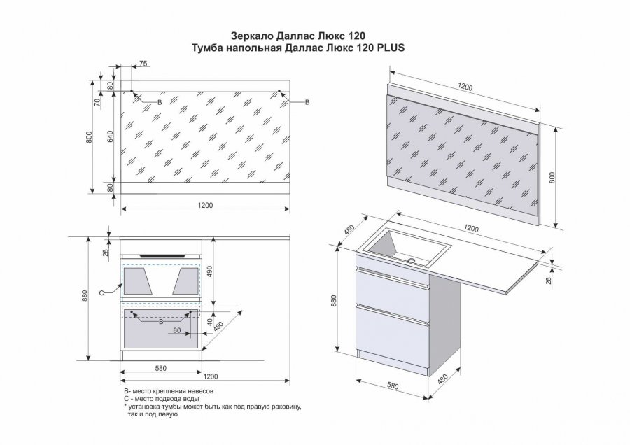 - Раковина Estetus Даллас 1200 левая (ш/г/в): 1200x480x120 мм
