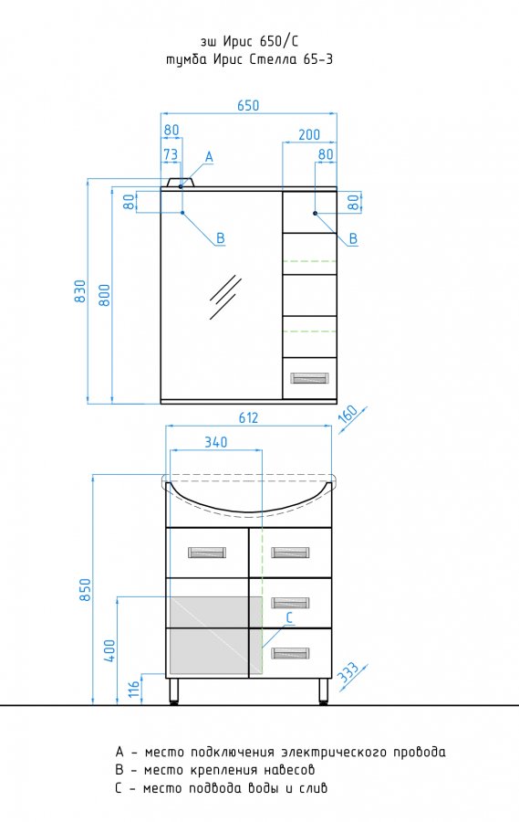 - Зеркало-шкаф (ш/г/в): 650x160x830 мм