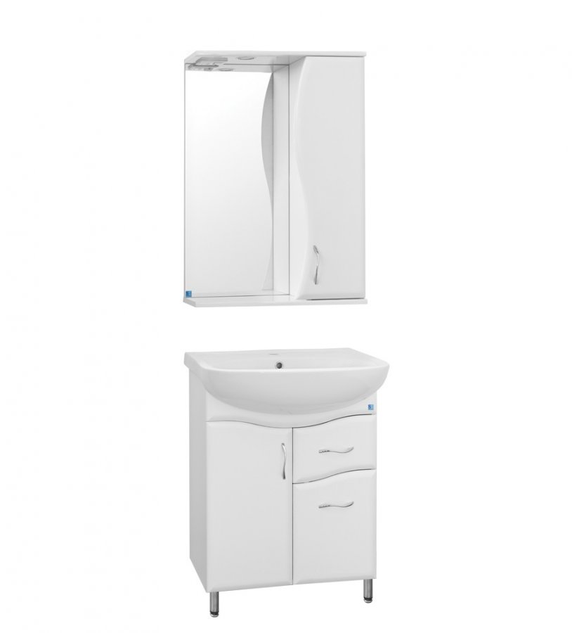 Мебельный гарнитур Style Line Эко Волна №11 55 в белом цвете со стилизацией фасадов под морскую тематику, станет довольно необычным и стильным приобретением для ванных комнат. Корпус изделий выполнен из качественной ДСП плиты, а глянцевые фасады – из МДФ. Завершением служит качественная хромированная фурнитура, установленная на выдвижных и распашных элементах тумбы. По Вашему желанию, можно выбрать один из трёх вариантов шкафчика. Это может быть, зеркало-шкаф Панда Волна, Лилия или Лорена.
